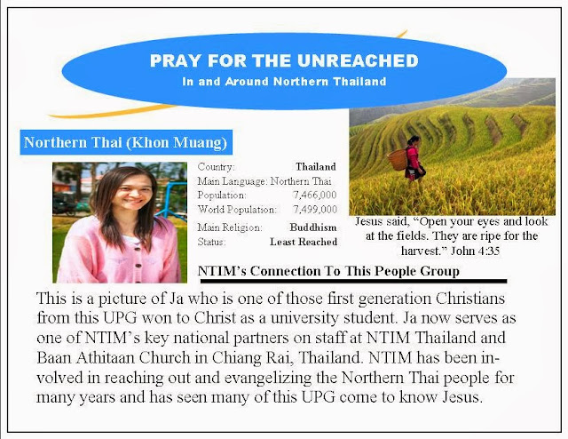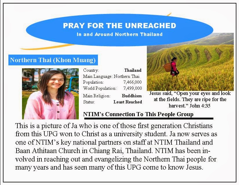 ople groups in this part of God’s World for the glory of God. Would you join us in this great effort as we seek to join God in what He is doing and wants to do in and through the Khon Muang UPG?