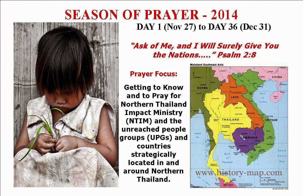 NTIM’s 2014 SEASON OF PRAYER is starting this Thursday. Please join us and receive daily devotional/prayer guides that will begin on Thanksgiving and take us to the end of the year. If you send me your email address, I will put you on our mailing list and you will receive daily devotional/prayer guides that will help you understand some of what God is doing in Southeast Asia and how to better pray for the expansion of God’s Kingdom. Please email Michael at pray4ntim@gmail.com